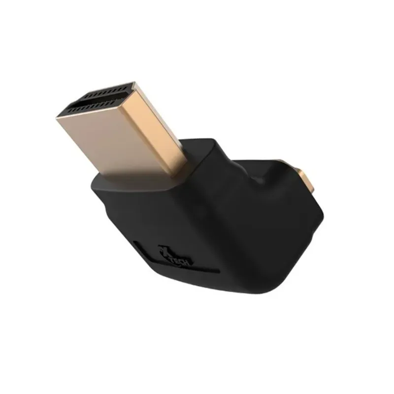 Adaptador HDMI en ángulo recto (90 grados), diseñado para optimizar el espacio y aliviar la tensión en los cables HDMI en instalaciones donde el televisor o la pantalla están cerca de la pared.