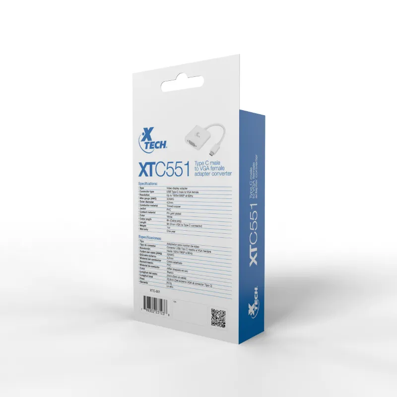Adaptador Xtech que permite conectar dispositivos con puerto USB-C a monitores o proyectores VGA. Ideal para presentaciones y configuraciones de pantalla externa.