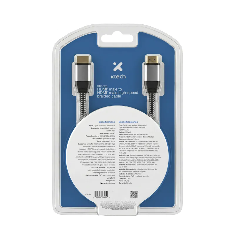 Cable trenzado HDMI macho a HDMI macho alta velocidad 1.8 m Xtech XTC-626