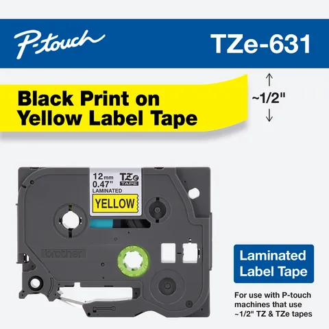 Cinta laminada original Brother TZe-631, color negro sobre fondo amarillo, ancho de 1/2″ (12mm). Color de alta visibilidad, ideal para etiquetas de advertencia o identificación.