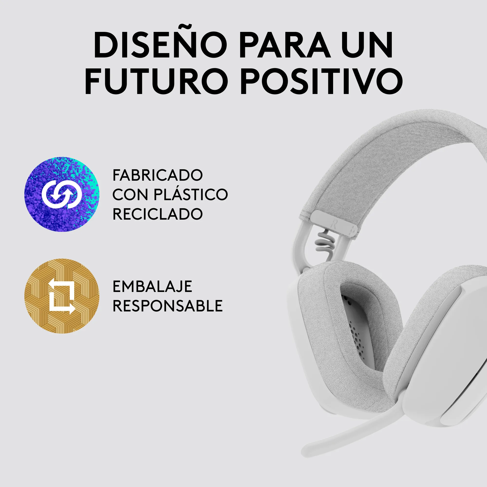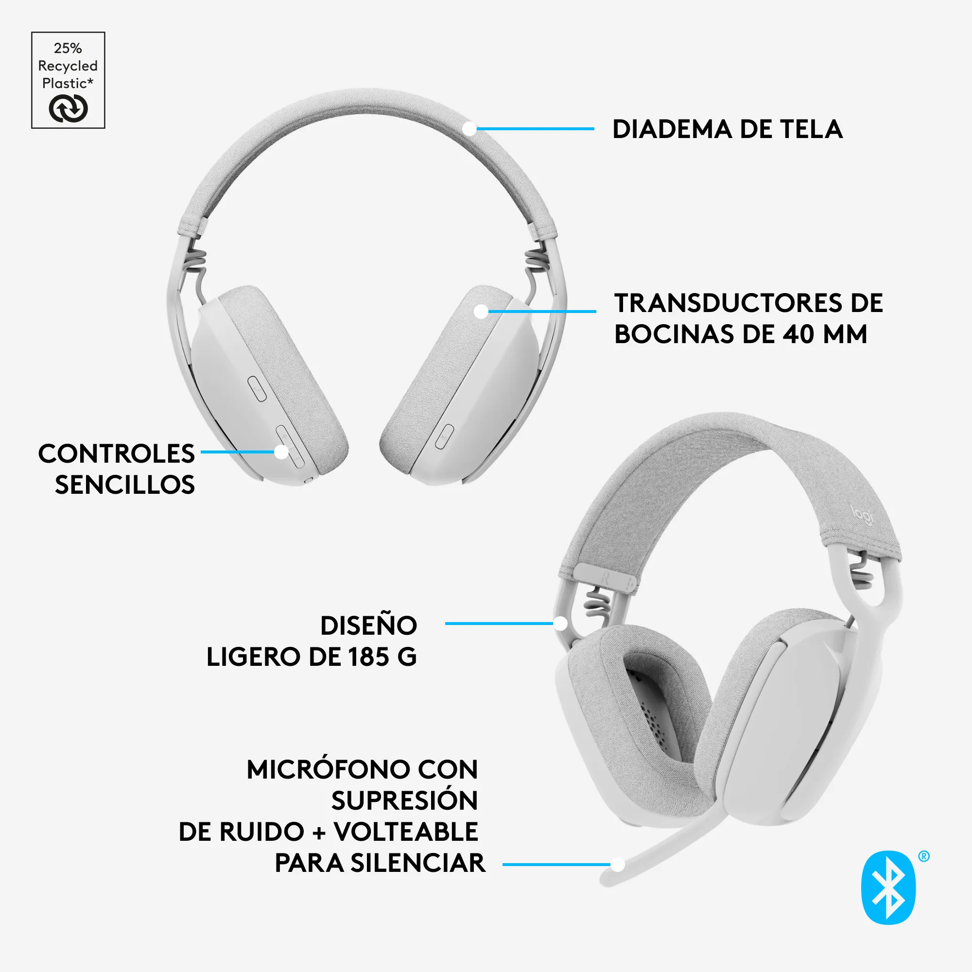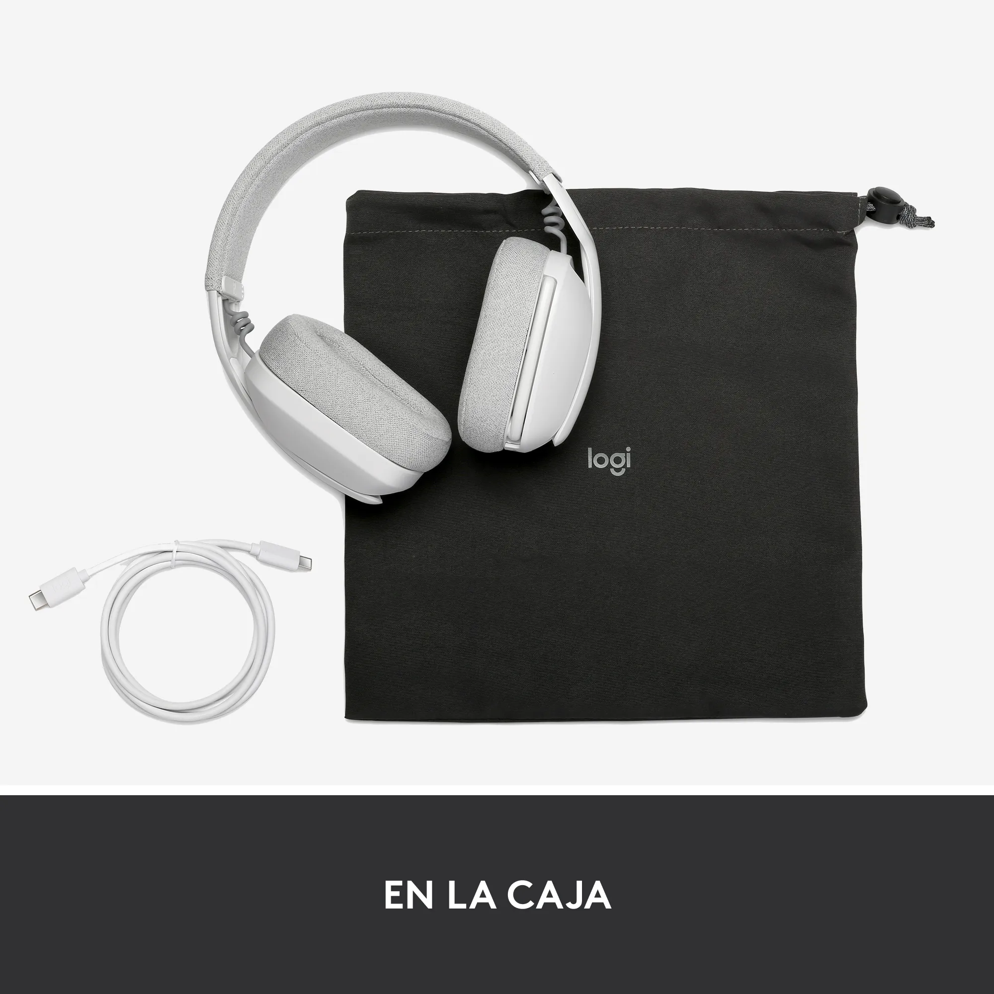 Auriculares inalámbricos Logitech Zone Vibe 100 con Bluetooth en color blanco. Audio inmersivo, micrófono abatible con anulación de ruido y diseño ligero. Ideales para trabajo y música.