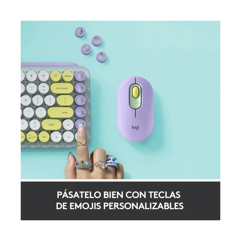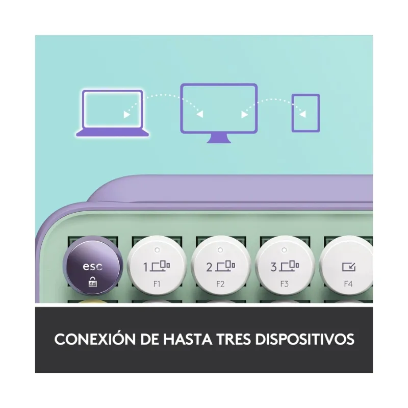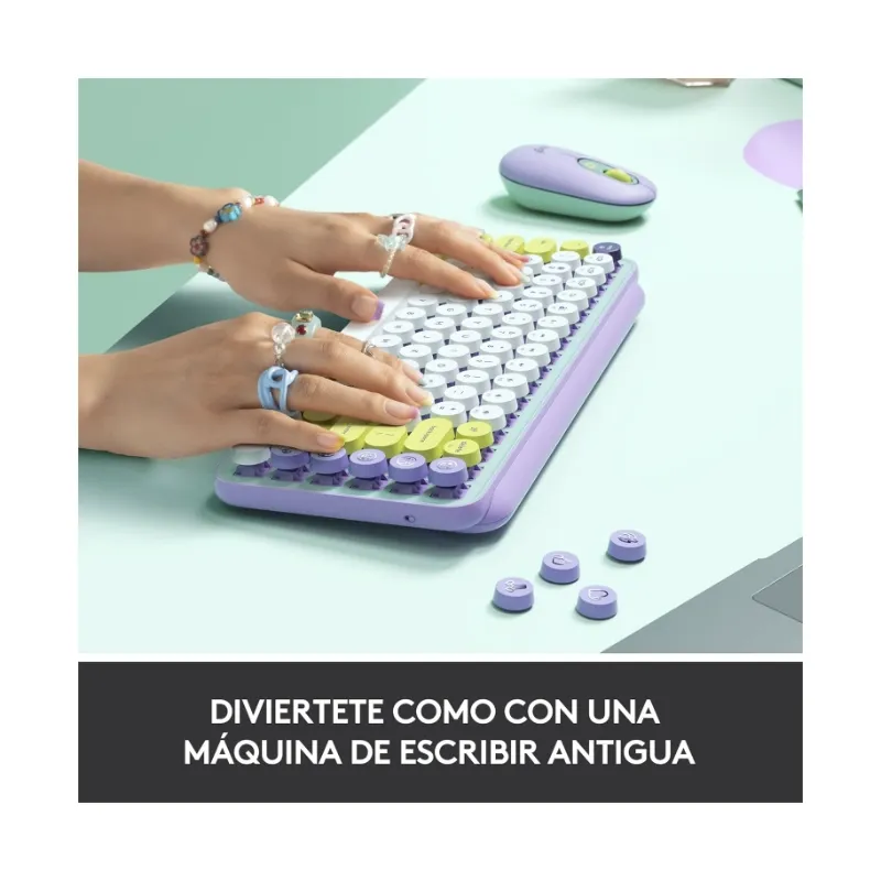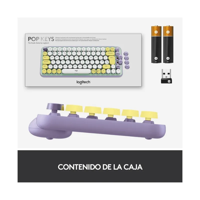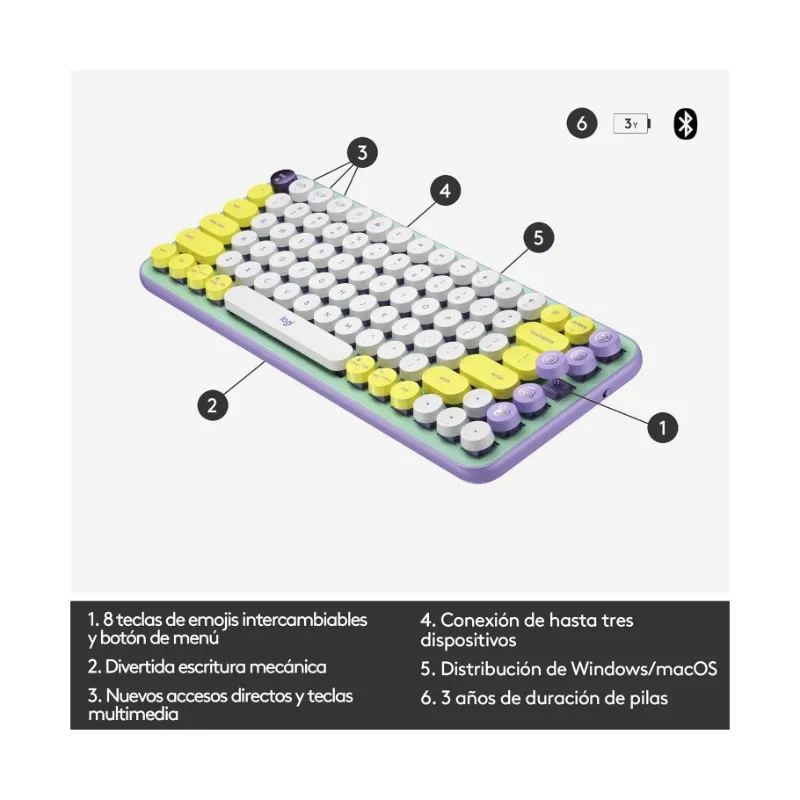 El Teclado Logitech Pop Keys en lila/verde. Teclado mecánico con teclas retroiluminadas, conectividad dual y botones emoji. Estilo vibrante y funcionalidad moderna.