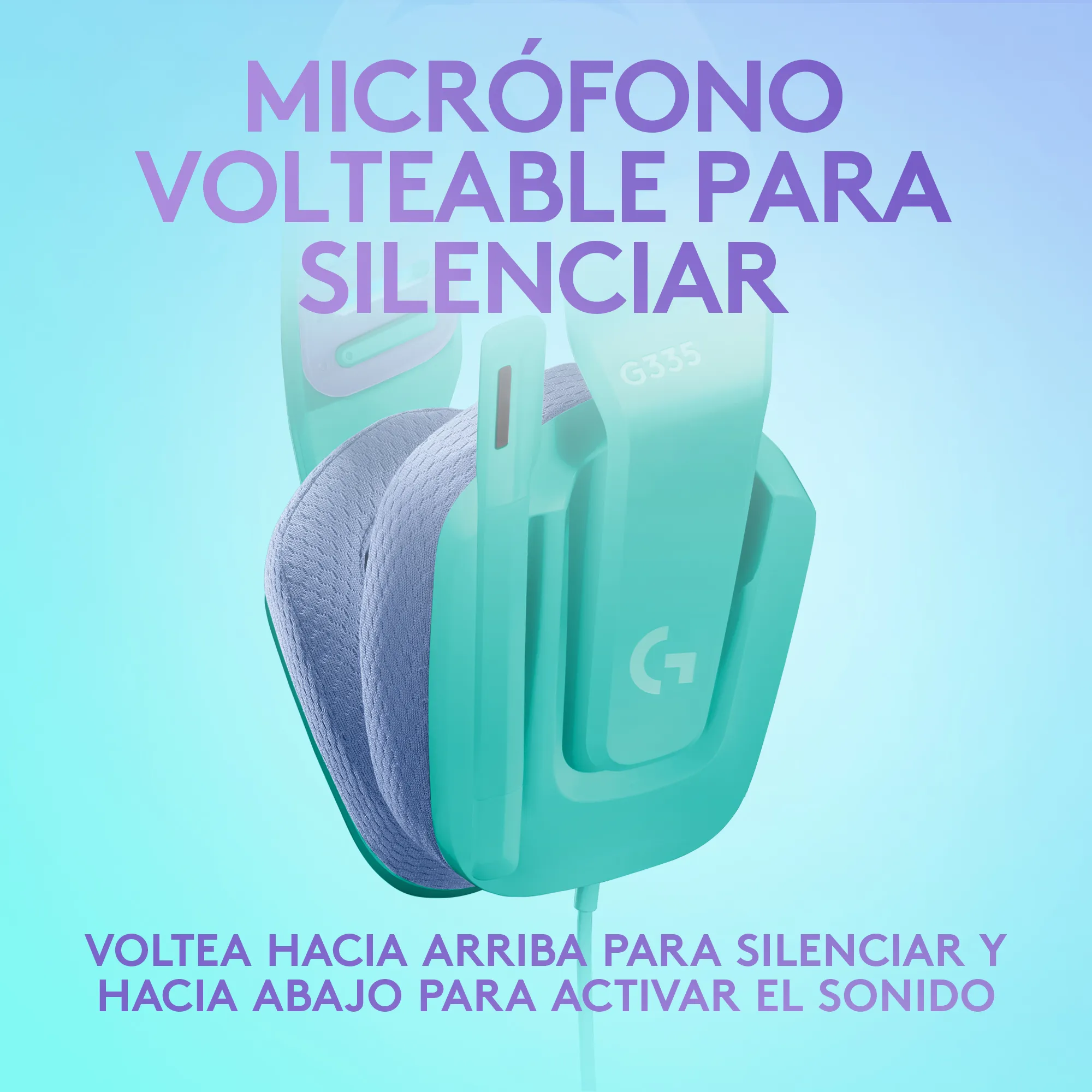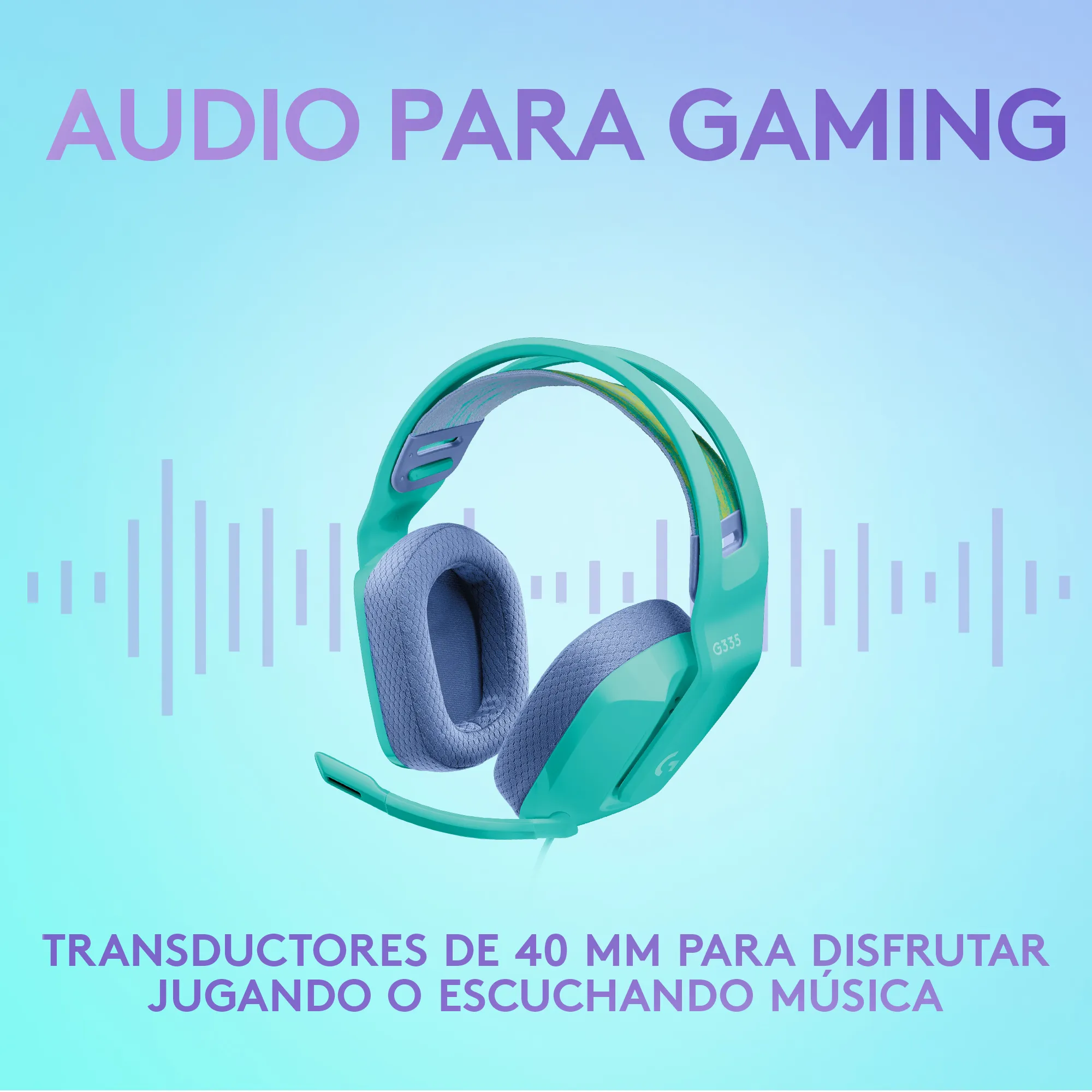 Auriculares gaming con cable Logitech G335 en color menta. Diseño ligero y cómodo, diadema de suspensión ajustable y micrófono abatible. Audio claro para sesiones de juego.