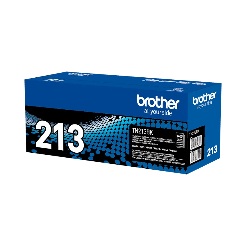 Cartucho de tóner original Brother TN-213BK en color negro. Rendimiento de aproximadamente 1400 páginas, compatible con impresoras láser a color Brother (ej: HL-L3210CW, MFC-L3750CDW).