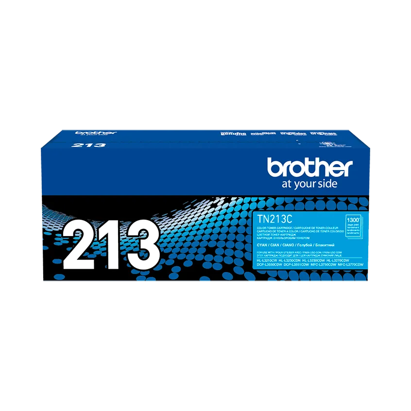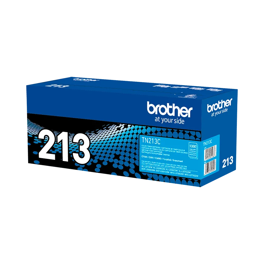 Cartucho de tóner original Brother TN-213C en color cian. Rendimiento de aproximadamente 1300 páginas, compatible con impresoras láser a color Brother.