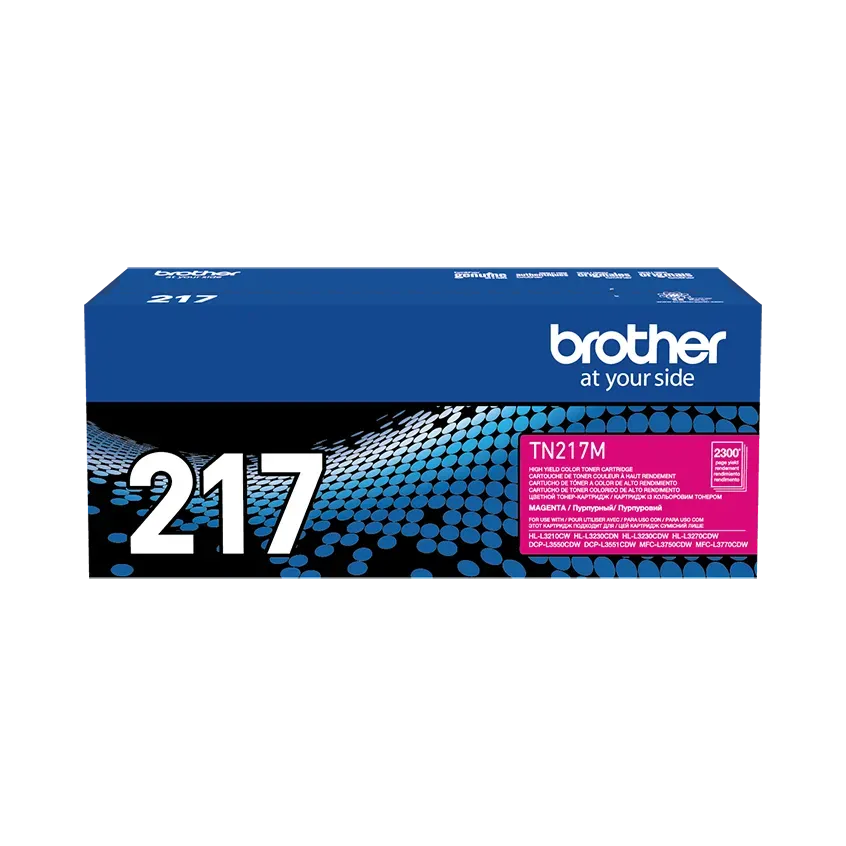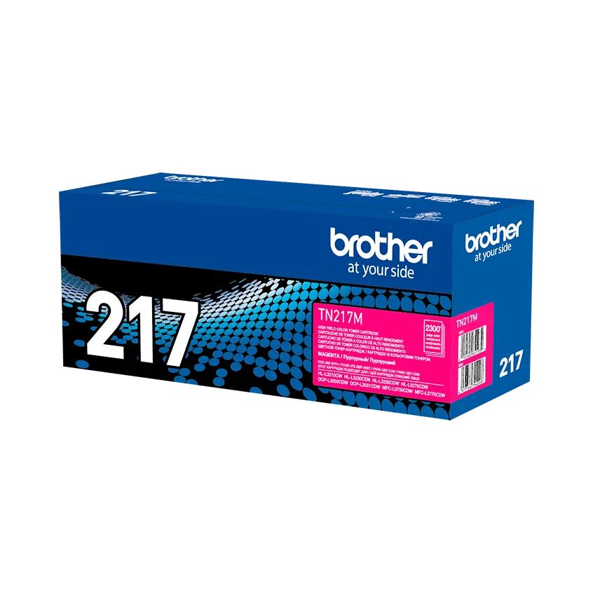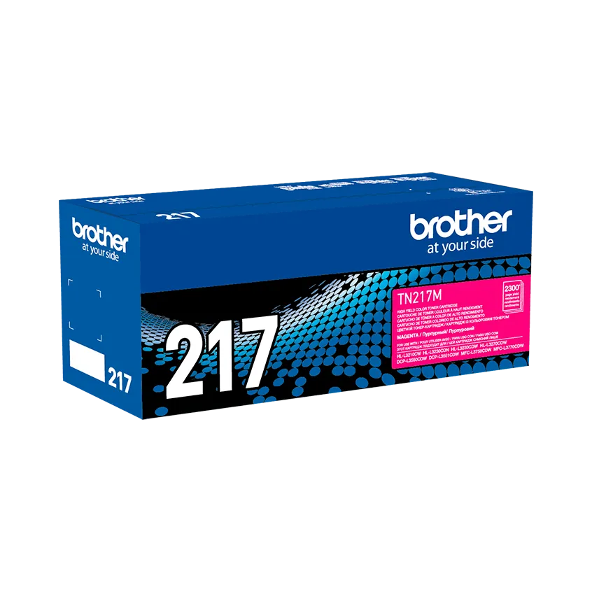 Cartucho de tóner original Brother TN-217M en color magenta. Versión de alto rendimiento (aprox. 2300 páginas) para impresoras láser a color Brother compatibles.