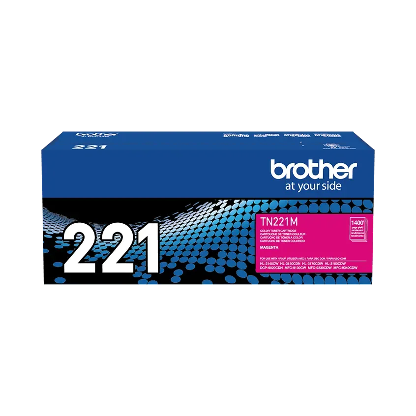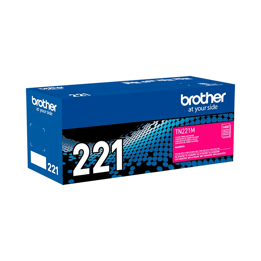 Cartucho de tóner original Brother TN-221M en color magenta. Rendimiento de aproximadamente 1400 páginas, compatible con impresoras láser a color Brother.