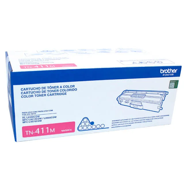 Cartucho de tóner original Brother TN-411M en color magenta. Rendimiento de aproximadamente 1800 páginas, compatible con impresoras láser a color Brother.